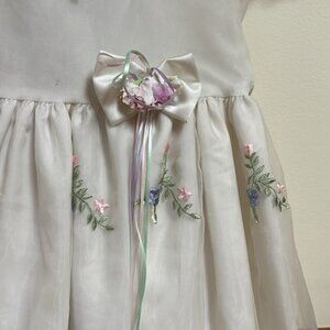 Vintage Pinokio Dress Perfect For Weddings, Pageants, Formal Events No Size See Measurements Below Armpit To Armpit 14 Inches Waist Across 13 Inches Length 36 Inches Think Tag Says Size 10 Made In USA Hand Wash Cold Hang To Dry Or Dry Clean 100% Polyester Dress Is Off White With Pink Yellow Green And Cream Flowers Small Tear Under Corsage About 1/2 Inch Long Very Good Vintage Condition