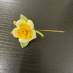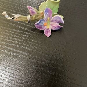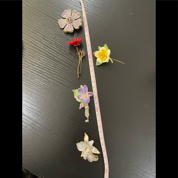 4 pins 1 hat pin. Hopefully the measurement’s are helpful. Ceramic are the hat pin and the lilac flowers. The other 2 metal. These are beautiful pieces. I am not a jewelry expert so any assistance with pricing I would appreciate your feedback.
