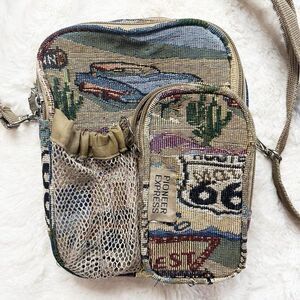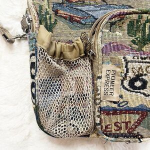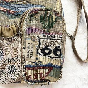 Vintage Pioneer Express Route 66 Tapestry Crossbody Canvas Bag. Exterior is in excellent condition, the inside has some parts of the sewing coming through but can be easily clipped as they show up. Adjustable, removable strap. Many pockets and pouches!