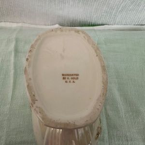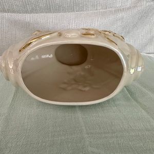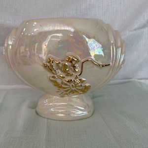 Vintage Pioneer Pottery, this Elegant Oval vase has a pearl iridescent color, Lusterware, with a bird and floral design in gold. This Rich, Elegant vase stands 7” high and 9.5” wide. Depth is 3.25 “ Stamped: Warranted 22 K. Gold, USA. Very Good Condition. A flower arrangement in this vase would make a beautiful centerpiece. (Christmas, Valentine’s, Bridal, etc)