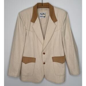This vintage Pioneer Wear coat, made in the USA, Albuquerque. Embodies classic Western-inspired style with timeless craftsmanship. Designed in a cream fabric, it features rich tan corduroy details on the notched collar & two large front pockets, adding both texture and contrast. The tailored silhouette is accented with button front closure & buttoned cuffs for a refined finish. A versatile piece that blends rugged charm with sophistication, perfect for collectors, vintage enthusiasts, or anyone seeking a standout statement jacket with authentic American heritage.