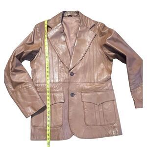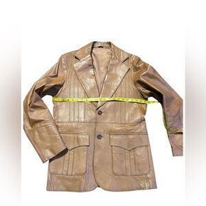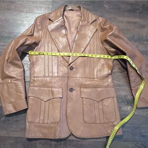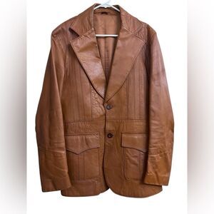Elegant tan leather jacket by PIONEER Wear. Features a smooth finish and inner pocket. Size 42. Vintage 1970’s men’s leather jacket.