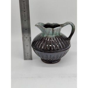 Vintage Pitcher Pottery Small Ribbed Scalloped Dainty Two Tone Teal Brown Handle