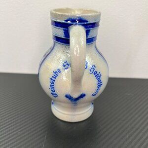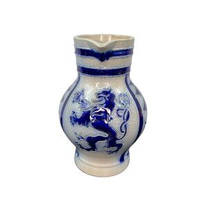 This handcrafted German stoneware pitcher features intricate blue lion and diamond patterns, adding a touch of classic elegance to any collection.