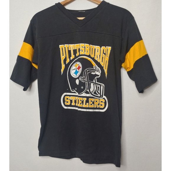 Vintage Pittsburgh Steelers Medium T Shirt Single Stitch Black V Neck Stripe NFL