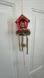 So Sweet this Vintage Pixie Elf Christmas Wind Chime. Features a Pixie Elf wearing Green Felt in a Red House, Gold Roof and Accents. Plastic Holly Berries and Leaves surround the base. Gold Wind Chimes. Collectible. SNP Chicago. 17”.