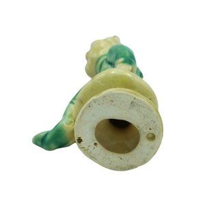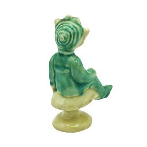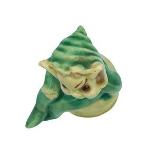 I don't honestly know if this is supposed to be an elf, pixie, wood sprite, leprechaun, or what! It is a bisque (? I don't know these materials well) figurine that could go in a fairy garden or hang out in your living room as decor. I believe that he is sitting on top of a mushroom. He has a bit of a mean look to him and it looks like he has little nubby horns on the top of his head. There is no marking. I see no chips or cracks but there is crazing. It measures 5" tall and is 3" at the widest part.