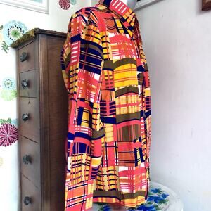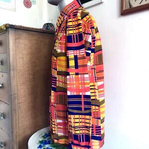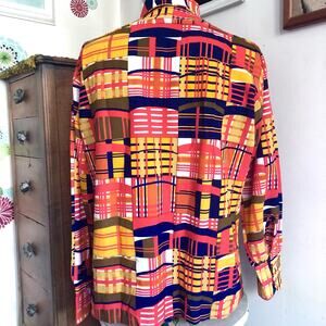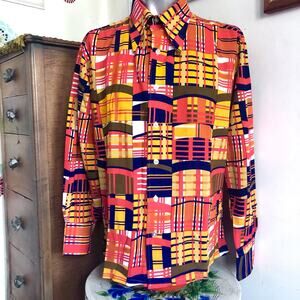 Phenomenal, groovy, bold, and colorful vintage shirt! This absolute STATEMENT comes to you courtesy of Jaime Roman. Rich shades of orange, marigold yellow, navy blue, olive green, and white, create this artsy free-flow plaid print. The collar is stiff and elongated, and the hem is straight in case you want to wear it untucked. Made of 100% "textured nylon", this shirt is pure 60s excess. Delectable dopamine dressing at its finest.