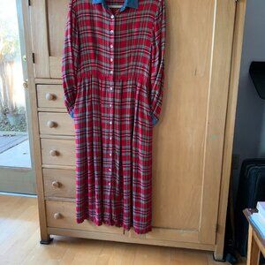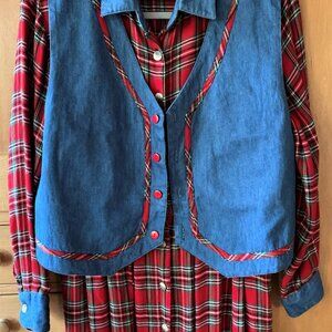 Vintage plaid dress with reversible vest. One side of vest is Christmas and the other is denim and plaid for any time of the year. Denim collar and cuffs on dress.