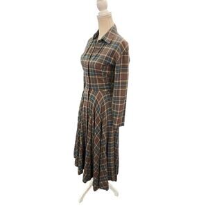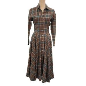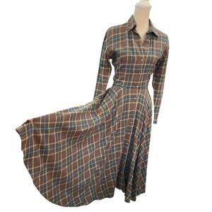 Embrace your inner forest creature with this unique vintage plaid dress, The earthy tones of brown, green, and blue in the plaid pattern evoke the mossy, vibes of a hidden glen.