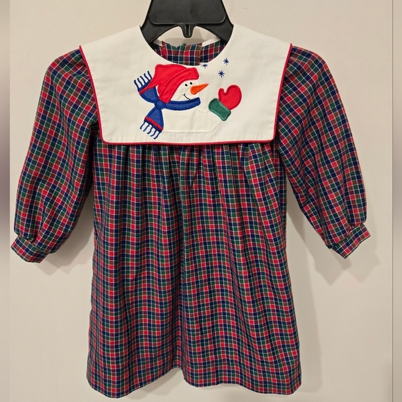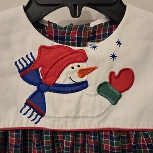 Charming plaid dress featuring a snowman embroidery. Perfect for festive occasions.