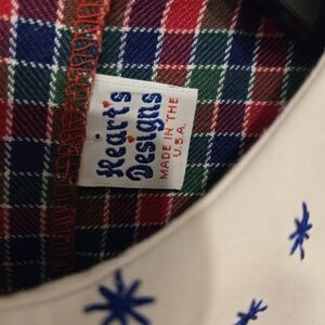 Embroidered snowman design on white collar with red trim. Red buttons at the bottom of long sleeves. Adorable design!
