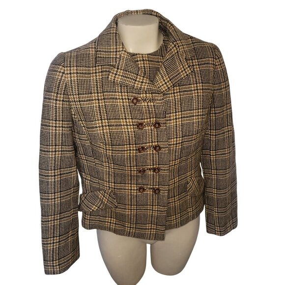 Vintage Plaid Wool Two-Piece Jacket Sleeveless Top Brown/Beige Checkered Women S