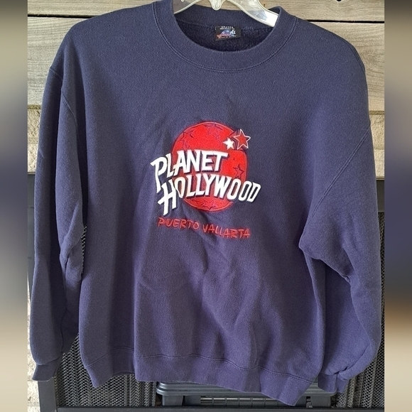Vintage Planet Hollywood women's size large crewneck sweatshirt Blue with Red planet Large spellout Embroidered logo See pictures for lay flat measurements Approximate measurements armpit to armpit 22" shoulder to shoulder 22" and shoulder to hem 25" See pictures for condition and description Rare