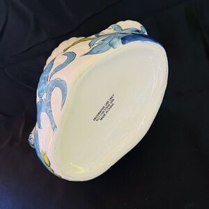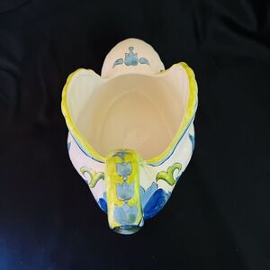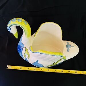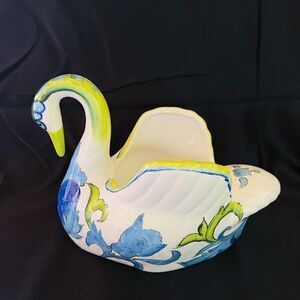 This vintage ceramic planter features a beautifully designed swan figurine holding a floral basket vase. The intricate art nouveau style and multicolored floral pattern make it a unique addition to any home décor collection. The ceramic material provides durability and a classic touch to the overall aesthetic of the piece. It is perfect for displaying your favorite flowers or as a standalone decorative item. Very nice condition.