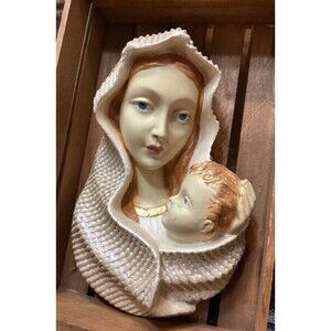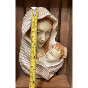 These vintage plaster chalkware wall hangings feature Baby Jesus and the Virgin Mary, measuring approximately 6 inches in height. The intricate paintings on these religious-themed pieces add a touch of faith and nostalgia to any space. Perfect for collectors or those looking to add a spiritual element to their home decor, these wall hangings are a unique and charming addition to any room.