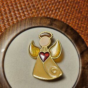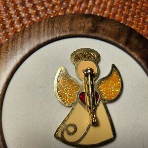 Add a touch of celestial charm to your ensemble with this Vintage Plastic Angel Pin. The multicolor design captures the essence of the ethereal beings that have inspired jewelry design for centuries. Fashioned by the brand known for their angelic creations, this piece is a subtle yet enchanting accessory for any outfit. Crafted from durable plastic, this pin is light and easy to wear, ideal for daily use or special occasions. Its timeless appeal makes it a versatile addition to your collection, complementing both modern and vintage aesthetics. No stones are set in this piece, ensuring a clean and unobstructed look that allows the simple beauty of the angel motif to shine through. (034)