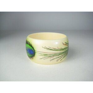 Vintage Plastic Bangle Peacock Feather Design Wide Bracelet Cuff Chunky