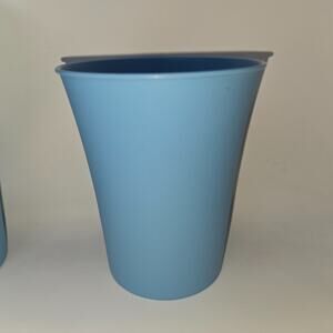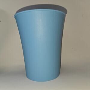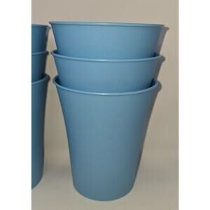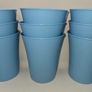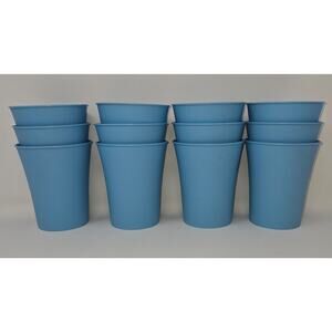 This is a lot of 12 Bell Tumblers in Light Blue. They are 8 oz cups that are 4.5 inches tall and 2.5 inches diameter. They are not Tupperware but nearly exact. They are in very good condition with no damage or defects.