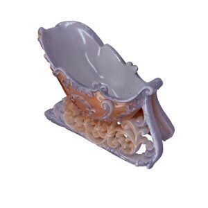 Charming vintage plastic sleigh planter from the 1980s, designed with ornate Rococo-style scrollwork and soft pastel peach and ivory tones. This lightweight decorative sleigh measures approximately 6" tall, 8" long, and 4.25" deep.