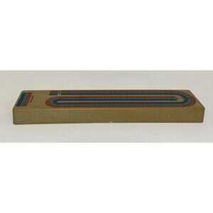 Classic plastic cribbage board game featuring a three-track scoring layout with red, blue, and green paths. The board includes a built-in sliding storage compartment that securely holds the original pegs and instruction sheet. Lightweight and durable, this set is ideal for travel, casual family game nights, or collectors of vintage board games. Pre-owned and in good condition with minor surface wear consistent with age and use.