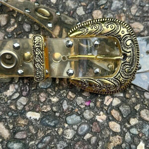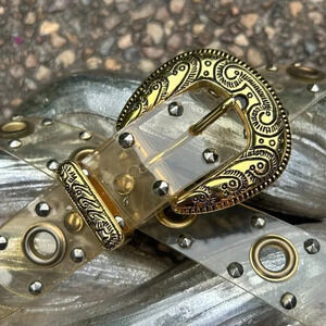 Vintage plastic PVC fashion belt with large grommet holes, studs and engraved gold tone buckle