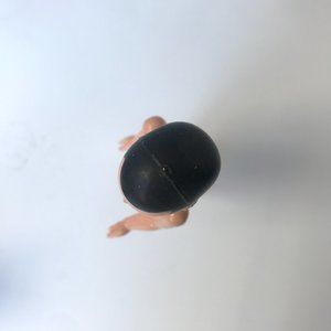 Overall in good condition. Doll shows wear that is consistent with age. There is some paint wear to the hair, some scuffing and a few marks.