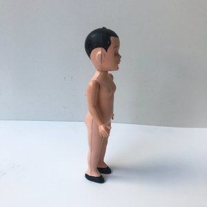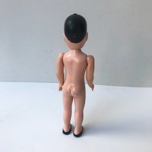 PMA doll features painted facial details, hair and shoes. The arms move and the doll's eyes close when laying down. Marked "PMA" on the back lower waist.