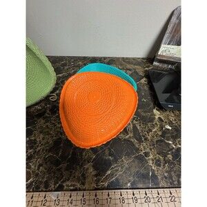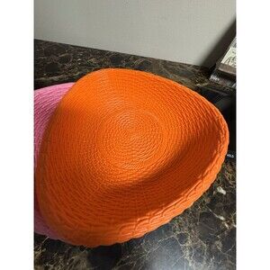 The product is a lot of 4 vintage plastic weave picnic plates by the brand Recline. These picnic plates are made of durable plastic in a basket weave design, perfect for outdoor dining or picnicking. The retro style and classic design make these plates a functional and stylish addition to any outdoor dining experience.
