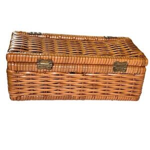 This vintage plastic wicker box is the perfect addition to any collection. With its unique design and sturdy construction, it is sure to be a favorite for years to come. Measuring 12 inches in length and 5 inches in width, this box is the ideal size for storing all your sewing supplies. The box features a buckle lock closure and handles for easy access and transport. The brown color adds a touch of elegance to any decor. Made from high-quality plastic, this box is durable and perfect for everyday use. The country/region of manufacture is unknown, adding to the mystery and charm of this piece.
