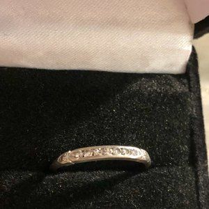Specs: Ladies platinum diamond band, set with 11 .01ct round single cut diamonds, SI1 in clarity & H in color set in a channel s