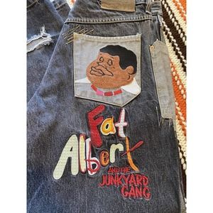 This pair of vintage FUBU Fat Albert and the Junkyard Gang denim pants is a must-have for any fan of the classic cartoon. The pants feature an embroidered logo and graphic print, with a solid blue color and regular fit. The size is 30x32 and the material is jean denim.