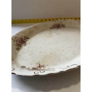 This vintage oval platter from Naomi features a beautiful floral pattern with pink roses on a cream-colored porcelain material. The scalloped edges add a touch of elegance to this 17-inch serving dish, making it perfect for displaying your favorite treats or serving a delicious meal. The item is in great shape and ready to be used for any occasion. Whether you are an avid collector or just looking for a unique addition to your tableware, this vintage platter is sure to impress.