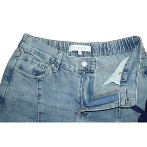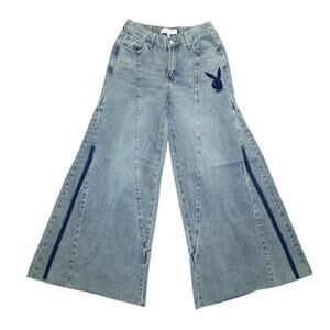 Authentic vintage Playboy wide leg jeans featuring a classic light wash denim, iconic Playboy bunny logo on the front, and bold Y2K streetwear styling. High-waisted fit with elastic back waist for added comfort, zip and button closure, five-pocket design, and raw edge paneling down the legs for a unique, edgy look. Size 5. Pre-owned and in great condition with minimal signs of wear.