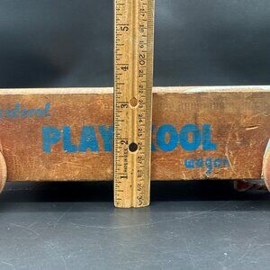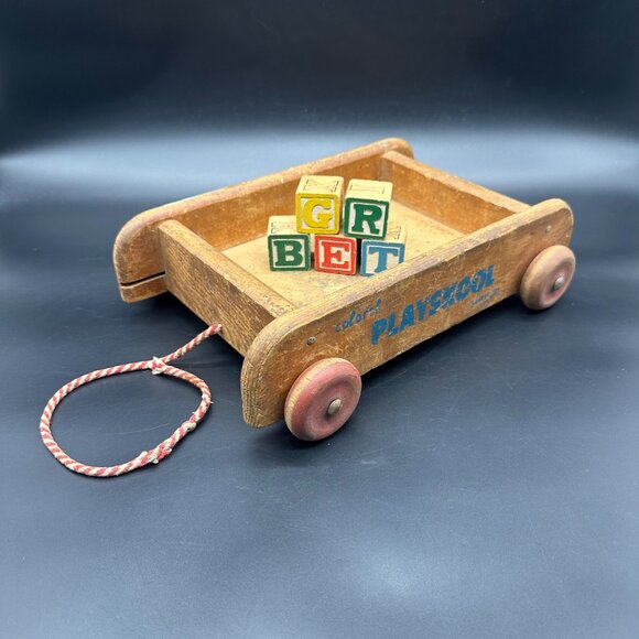 Vintage Playskool Wooden Wagon Pull Toy Blocks Rope Handle 1960s Mid Century