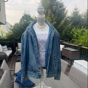 Classic washed denim jacket with structured pleated shoulders and cinched back waist for that perfect 80s/90s silhouette. Snap-button closure, front pockets, and soft broken-in feel. Unmarked size, best fits like a women’s medium. Some light wear adds to the authentic vintage vibe.