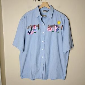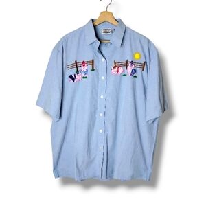 Whimsical pig farm embroidery on both chest panels, classic button front, short sleeves, and a soft light-blue (chambray-look) fabric. Easy, relaxed fit—perfect with jeans or overalls for farmcore/cottagecore vibes.
