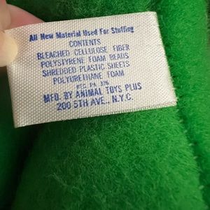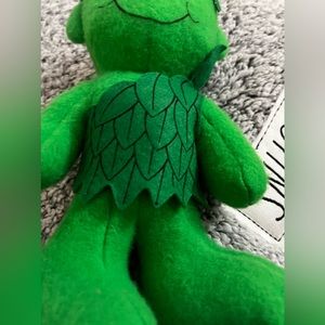 Vintage plush is 12 in in length and 6 in from arm to arm, felt clothing and plastic eyes.