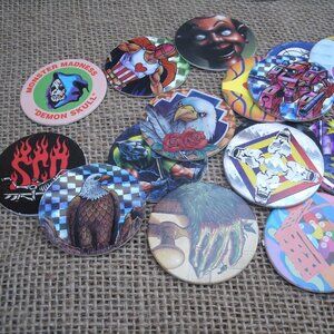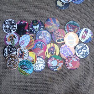 tags: pogs, set, collection, collectible, plastic tube, goose bumps, slammer whammers, skulls, horror, sports, animals, bugs, eagle, american flag, skeletons, reaper, tribal, weird, strange, game, milk caps