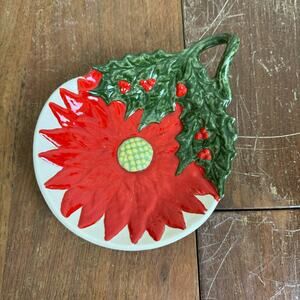 Vintage Poinsettia Ceramic handmade hand painted Signed Candle holder candy dish