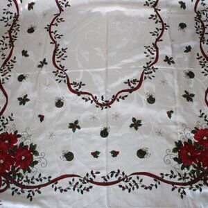 Vintage Poinsettia Holly Berries Holiday Fabric Rectangle Tablecloth 114" X 58"