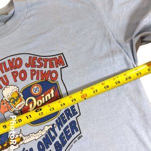 Description: Stevens Point, Wisconsin (c) Point Brewery, Inc. 1984. The top red script is Polish, "Ja Tylko Jesten Tu Po Piwo" which translates to, "I'm just here for the beer." That is also written in blue on the lower part of the design. Super fun and colorful. Point Special Beer.