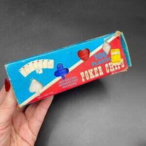 Set of vintage plastic poker chips - I love the design of this box with the little card suit cut-outs! In good condition if your collecting it for the vintage packaging. Box looks full, so I'll assume all the chips are there. Smoke Free Home. Thank You For Checking Out This Listing, Please Check Our Profile To Bundle Or Make Offers.
