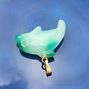 VTG: Playful, varying tints of green polished jadeite (jade) gemstone pendant charm in a sculpted dolphin shape including fins & etched eyes/mouth. In excellent preloved intact condition.