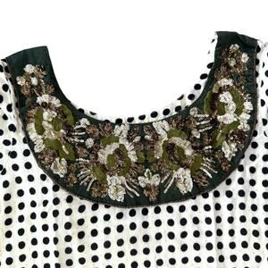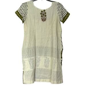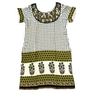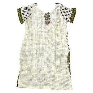 Boho-style dress featuring a mix of green polka dots, floral block print, and embroidered neckline detailing