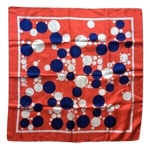 This vintage silk scarf features a bold polka dot design evocative of mid-century aesthetics. The hand-rolled hem showcases traditional craftsmanship, and its vibrant colors remain vivid, making it a timeless accessory to elevate your wardrobe.