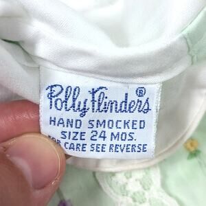 Vintage Polly Flinders Dress in a gorgeous light mint green with a pastel smocked chest. Size is tagged as 24m, but is estimated as 9m. Please check the measurements provided.