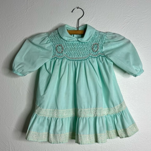 Vintage Polly Flinders Green Hand Smocked Lace Trim Circle Dress Size 2 Toddler
