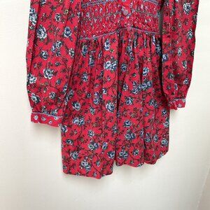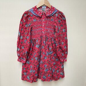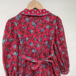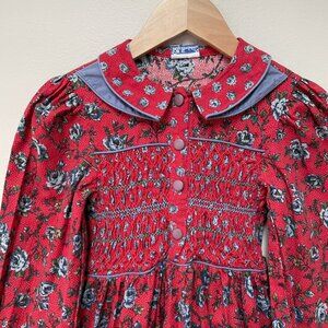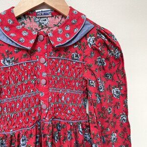 This is gorgeous! Vintage Polly Flinders red and blue floral dress. Long sleeves with slight puff at shoulders, shirred bodice with unique buttons up front. Beautiful folded collar. VGUC for some wear as it's vintage. No sizing tag but it's about a size 5. Please ask for measurements.