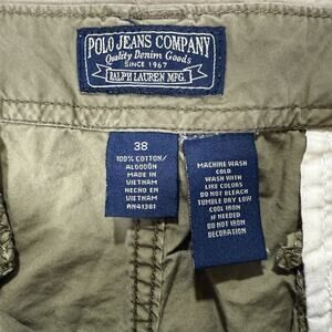 The product is a pair of vintage Polo Jeans Co. Ralph Lauren cargo shorts in a men's size 38, featuring a solid green color and a Y2K flag accent. Made of cotton fabric with a canvas texture, these shorts have a zip closure, flat front, and cargo pockets. Perfect for various occasions including travel, casual, formal, workwear, and business, these shorts are machine washable and easy to care for. The vintage design, accented with buttons, zippers, and the brand's logo, adds a retro 90s army-inspired theme to the overall style.